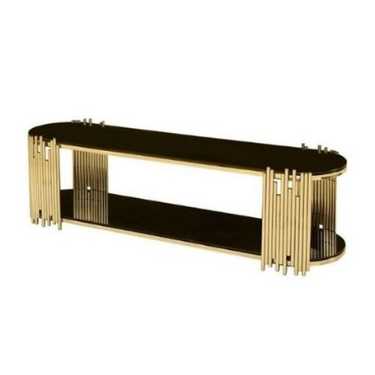 Upgrade your entertainment area with the Black Glass Top and Titanium Golden Stainless Steel Base TV Stand, and enjoy the perfect blend of form and function in your living space.